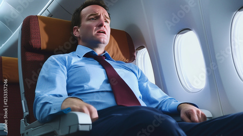Nervous Traveler: A Man in a Blue Shirt and Tie Anxiously Sits in an Airplane Seat