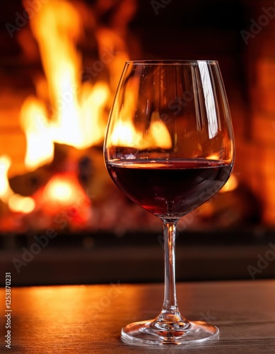 A beautifully crafted glass holds deep red wine, contrasting with the glowing warmth of a crackling fireplace. Perfect for cozy evenings, this visual captures the essence of relaxation and enjoyment