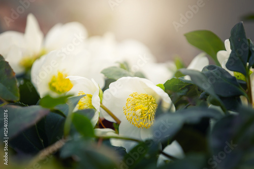 Ciemiernik (Helleborus L.), białe kwiaty, sezon wiosenny w ogrodzie
