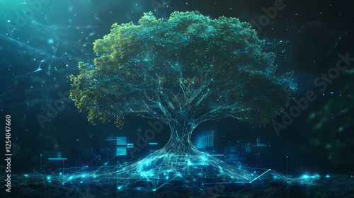 Digital tree with branches of business strategies, symbolizing organic growth and interconnectivity growth strategy, ecosystem approach. Glass-Encased Ecosystems. Illustration