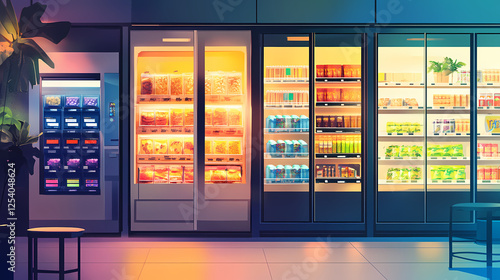 Micro market (small automated unmanned vending store) full of food stands in office, coworking, lobby or hotal hall. soft focus. automated food business theme. Glass-Encased Ecosystems. Illustration