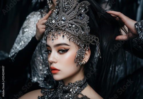 Dark Elegance: A Woman in a Silver Crown, Captivating Portrait
