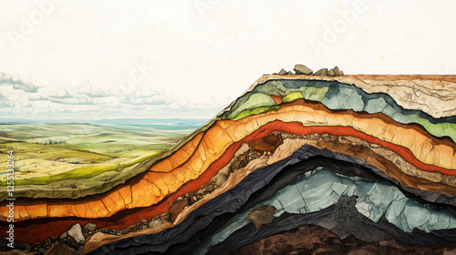 Geological cross-section of the Earth showing different layers of soil with deposits of minerals such as coal, oil, iron ore, and rare earth metals