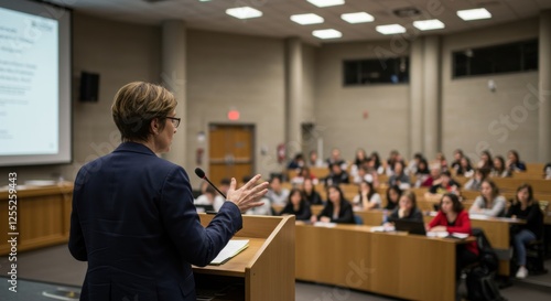 Speaker addressing audience in modern lecture hall with professional presentation setting