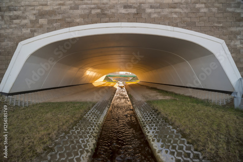 Strumień płynący pod mostem drogowym w zimowe popołudnie. Mały strumień płynie przez łagodnie opadający betonowy kanał pod nowoczesnym mostem drogowym. Słoneczny zimowy dzień w pobliżu Ostrowca Św.