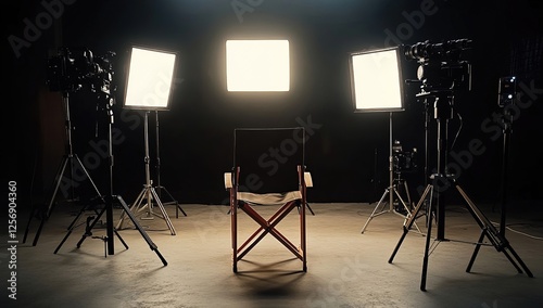 Filmmaking Studio Setup: Cameras, Lights, and Director's Chair Ready for Action