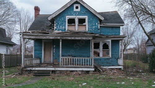 Abandoned house in a run-down neighborhood, weathered blue siding, broken windows, porch collapse
