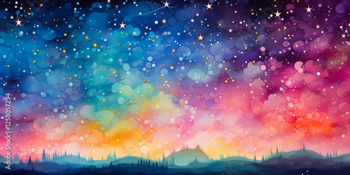Kolorowe nocne niebo nad sylwetkami, ilustracja