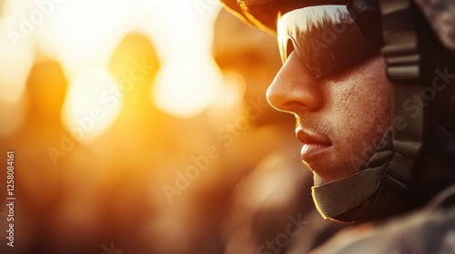 A close-up portrait of a soldier in tactical sunglasses, capturing an intense expression that conveys focus and determination during a mission.
