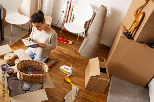 Young woman unpacking cardboard boxes at new home.Moving house.Reading old book.