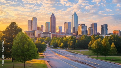Atlanta City Skyline at Sunrise with Empty Road and Lush Greenery