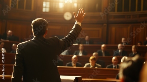 #1258673545A man stands in front of a wooden paneled room with his arms outstretched