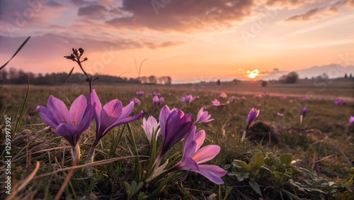 Crocus Field Sunset: A vibrant field of delicate purple crocus blossoms bathed in the golden light of a breathtaking sunset, a picturesque scene of tranquility and beauty.
