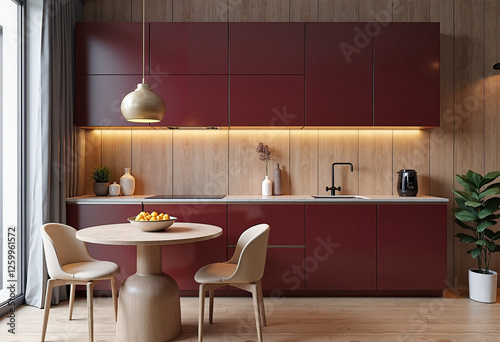 Modern kitchen with burgundy cabinets and minimalist design, warm and inviting ambiance. Interior decor concept.
