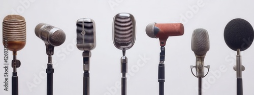 Diverse Microphone Designs, showcasing old school, modern, and wireless styles, set against a clean white backdrop, emphasizing variety and evolution