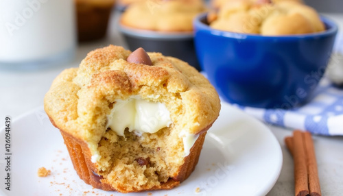 A close-up of a banana nut muffin with a creamy cheese filling, fresh from the oven, served on a plate, making a tasty and wholesome treat for breakfast or a snack.