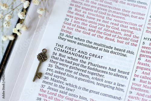 First and great commandment text in open holy bible book. Close-up. Christian love, faith, and obedience to God Jesus Christ.