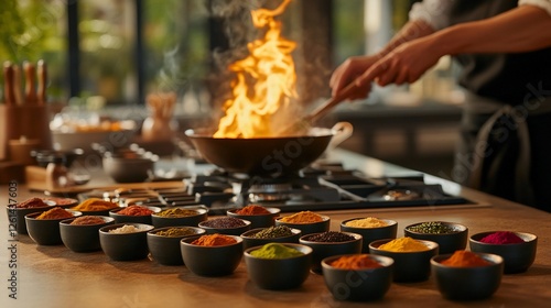 Chef flambéing food in a wok, with colorful spices in small bowls on the counter.
