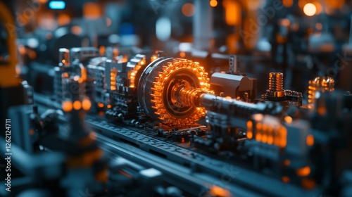 Automated machines work efficiently on a car assembly line, precisely installing fuel systems and brakes. The vibrant setting showcases advanced manufacturing technology in action