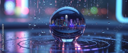 Crystal ball reflecting city lights lies on futuristic surface with falling drops.