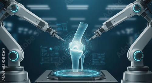 Robotic arm reaching for digital holographic human knee. AI assisted orthopedic surgery treatment. Advanced trauma care. Modern knee replacement technology. Healthcare innovation. Banner.