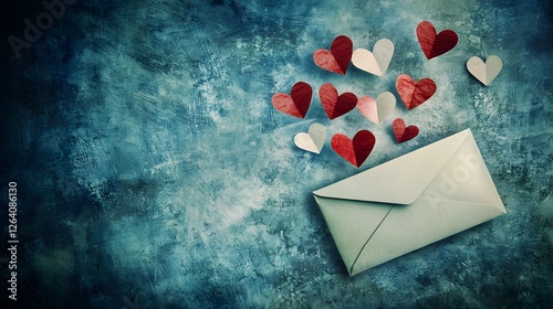 Romantic love and wedding card concept with paper hearts in various shades of red and white floating and scattered from an envelope on a soft textured blue background Elegant dreamy