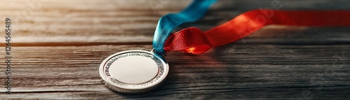A close-up view of a silver medal with blue and red ribbons on a wooden surface.