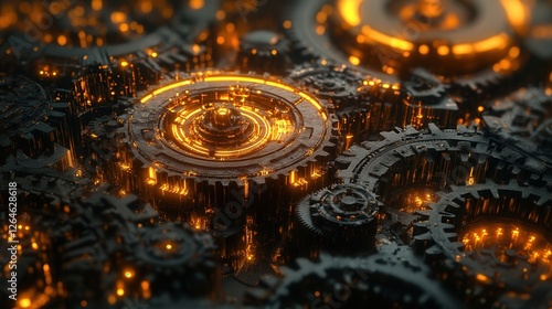 Glowing Gears in Motion, an intricate digital visualization of interconnected gears radiating light for harmonious functionality