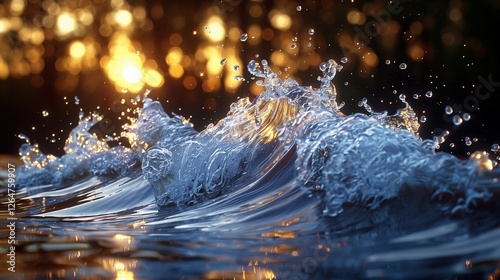 Dynamiczne rozpryskiwanie się fal wodnych z niewyraźnym odbiciem złotego światła słonecznego na naturalnym tle