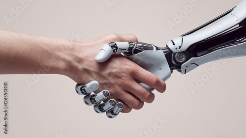A human hand shakes a robotic hand, symbolizing collaboration between technology and humanity.