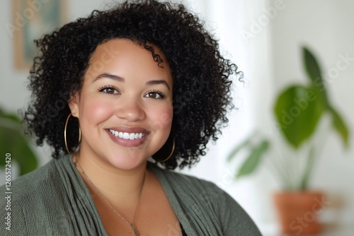 Smiling african female adult with curly hair in a cozy interior