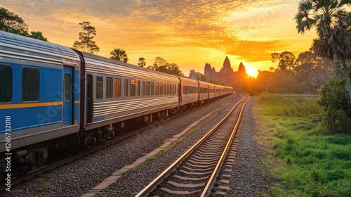 A passing train offers a breathtaking view of Angkor Wat, Cambodia, bathed in golden sunrise light.