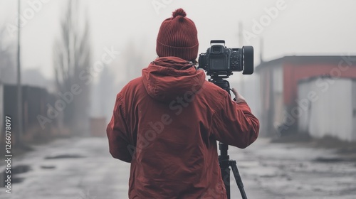 Person filming on tripod in misty urban alleyway; documentary or vlogging