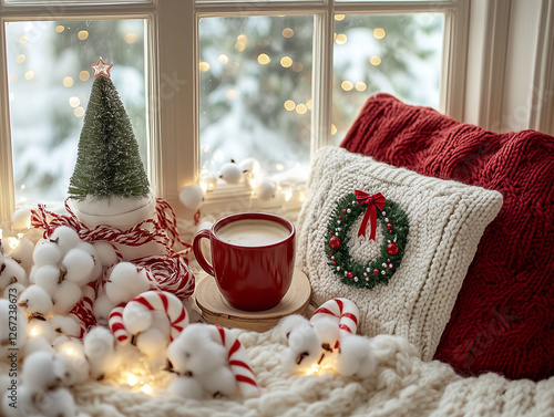 Czerwony kubek z kawą obok świątecznych poduszek i okna