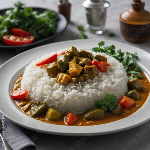 A plate of rice served with green curry, chicken, and fresh red chilies for a flavorful meal. A plate of curry with chicken, served with rice and garnished with herbs.