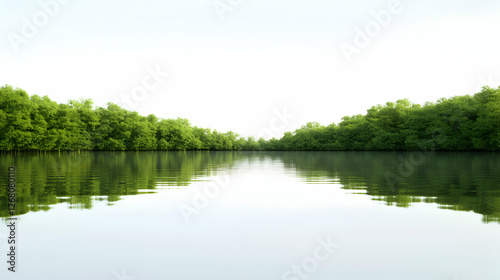 A serene landscape showcasing a calm body of water reflecting lush greenery on the banks