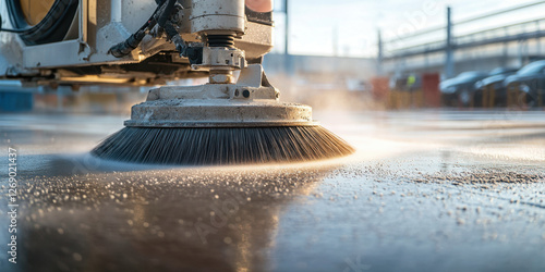 Close-up view of an industrial floor sweeper cleaning a large, smooth surface in an outdoor facility under bright sunlight