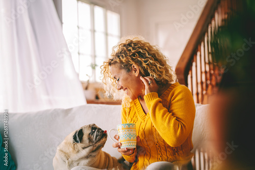 Adult female relaxes on a comfortable sofa at home while engaging with her beloved pug to share genuine comfort and unwavering support, reinforcing daily well-being and emotional balance throughout