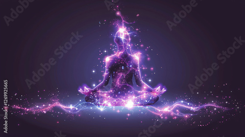 A meditative figure sitting in a glowing aura, with neural pathways forming into stars above, symbolizing deep subconscious transformation and belief energy.