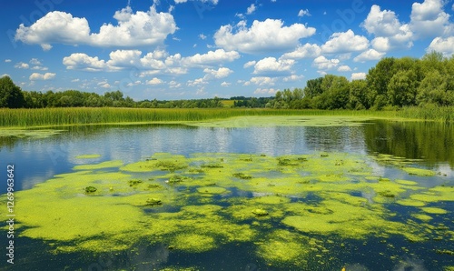 A close-up of green algae bloom in a lake, symbolizing water pollution from agricultural runoff, Algae bloom, water contamination