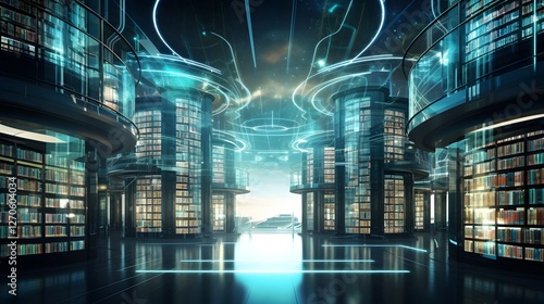 Futuristic digital library interior featuring bookshelves and advanced holographic search tools offering a cutting edge learning environment for the 21st century