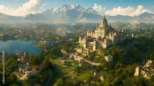 Grand Citadel Overlooking Cityscape Lake and Distant Peaks Serene Scenery Majestic Architecture