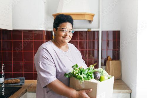Food delivery service. Side view of overweight senior african american female holding carton box full of fresh vegetables and greens, going to prepare delicious healthy dietary meal