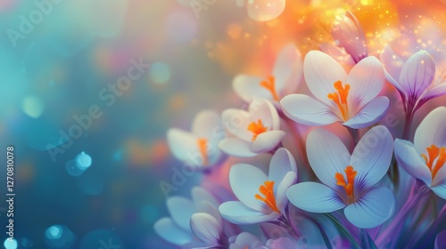 Vibrant white crocus flowers with a blurred colorful spring background.