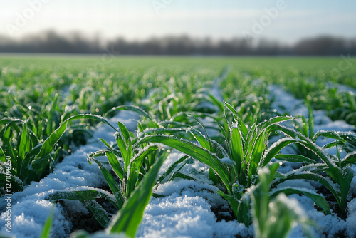 Rzędy zielonych upraw na pokrytym śniegiem polu w zimowy dzień na wsi