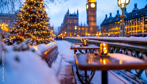 Christmas tree, Big Ben, and tables covered by snow. Travel photo for winter holiday