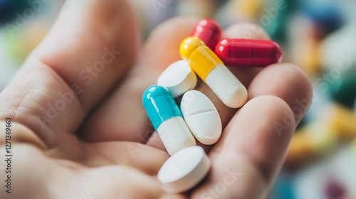 Various colorful medication capsules and tablets held in hand illustrating health and wellness concepts : Generative AI