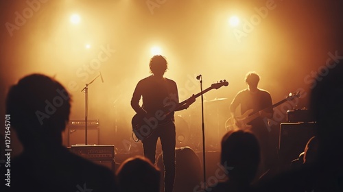 Silhouettes of people at a music festival, watching the live performance from the stage, illuminated by vibrant stage spotlights