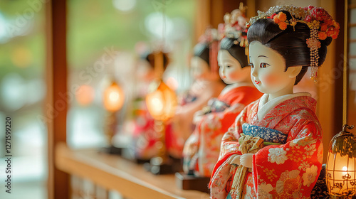 Hinamatsuri display with tiered hina dolls and cherry blossom decorations in a traditional Japanese home. Girls' Day celebration, prayers for the health and happiness of girls with festive decorations