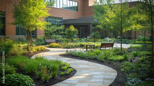 Serene courtyard garden path, hospital building background, peaceful healing space